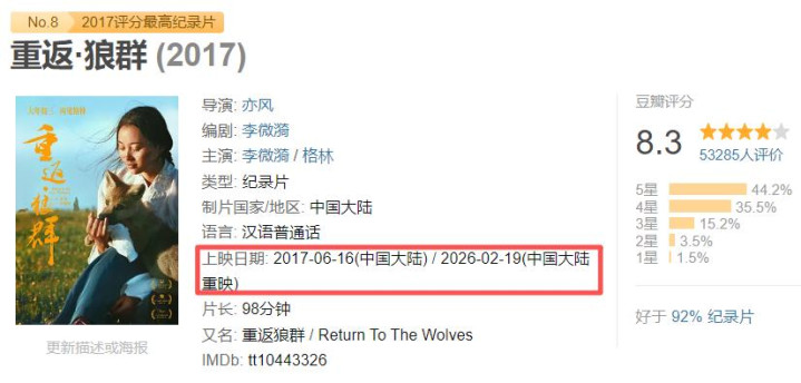 纪录片《重返狼群》官宣重映,预计票房不会达到100万人民币。